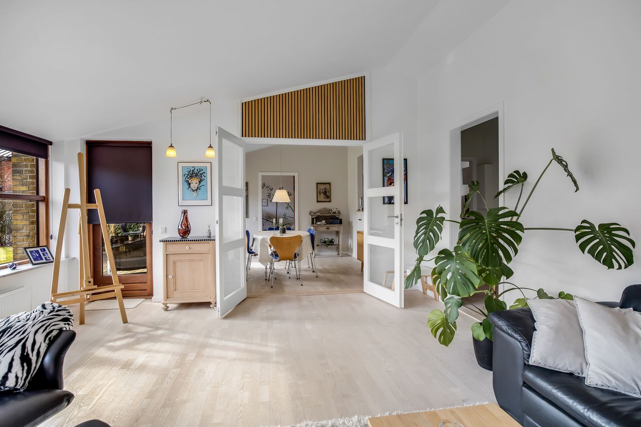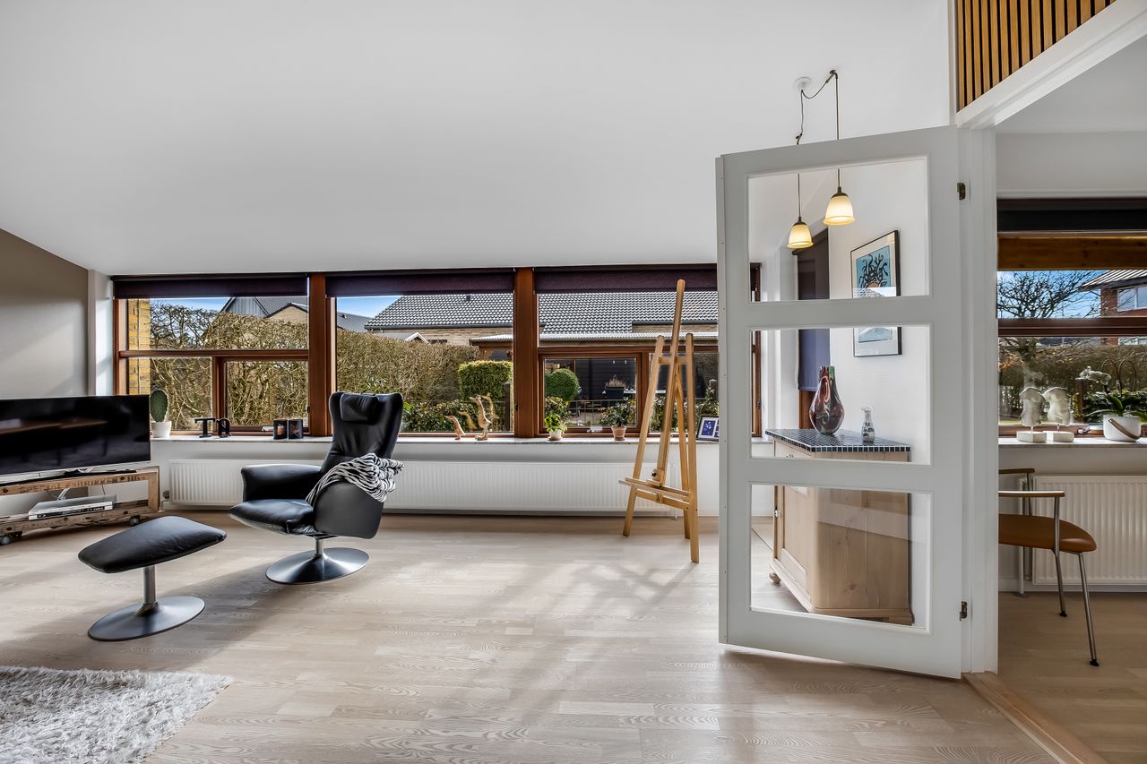 Boligen indeholder desuden et soveværelse med skydeskabsarrangement samt et ekstra værelse, som kan anvendes til børneværelse, kontor eller gæsteværelse. Badeværelset er istandsat i 2021 og fremstår pænt og tids-svarende med håndvaskearrangement fra Kitchen, bruseniche og gulvvarme. Praktisk bryggers med gulvvarme og grå klinker.