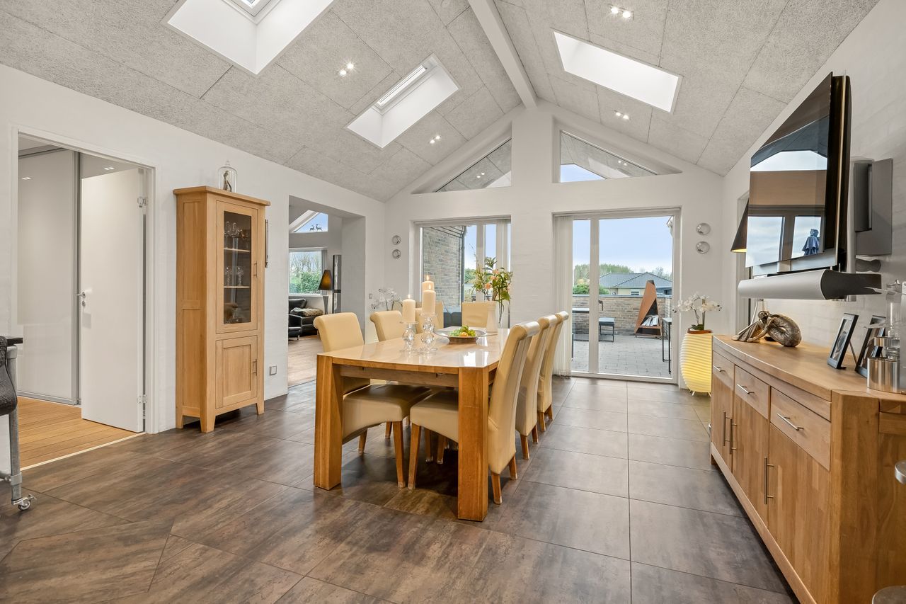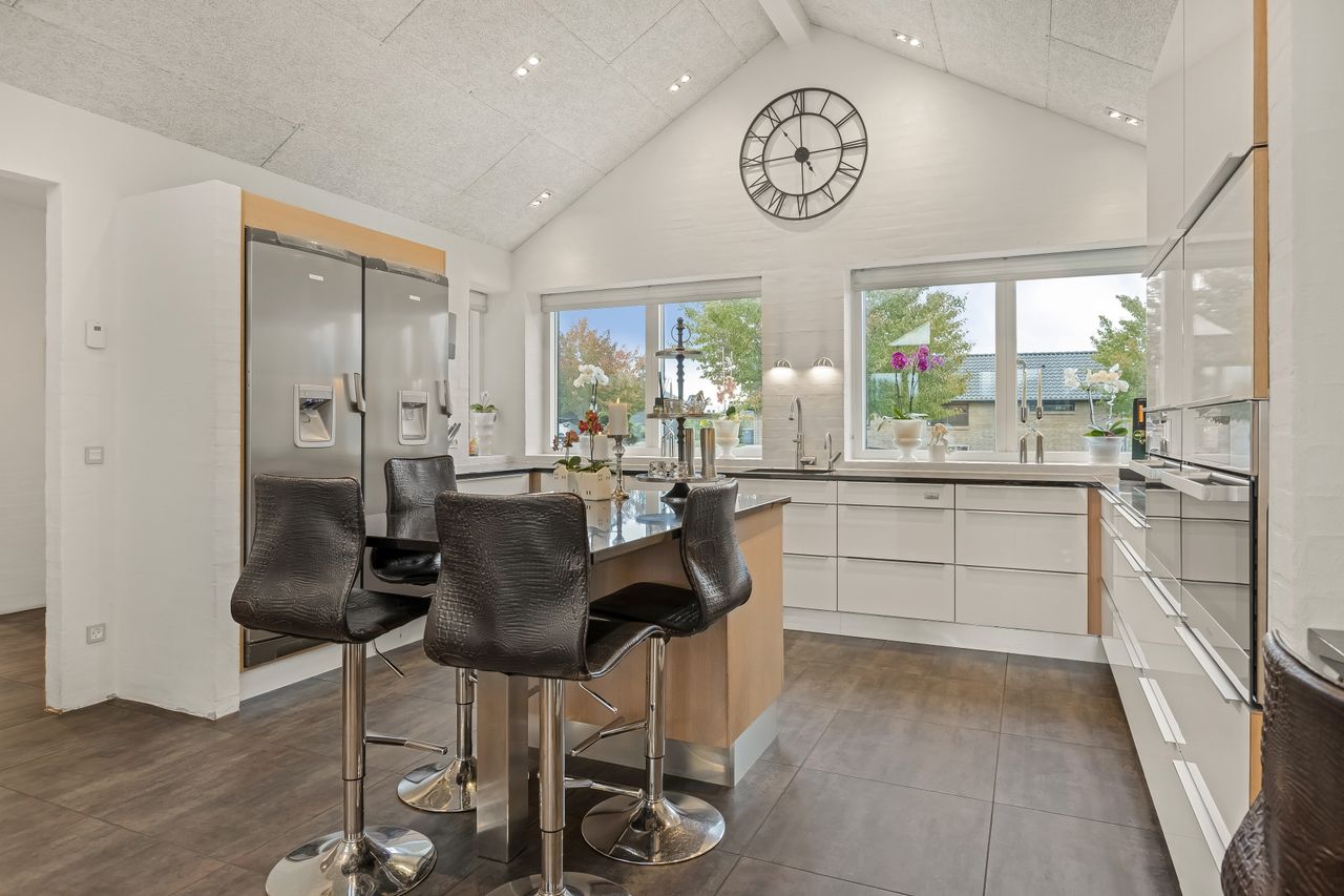 Bryggerset ligger praktisk i vinkel til hall'en og har skydeskabsarrangement samt direkte adgang til en dejlig garage med stentæppe, gulvvarme og automatisk portåbner.