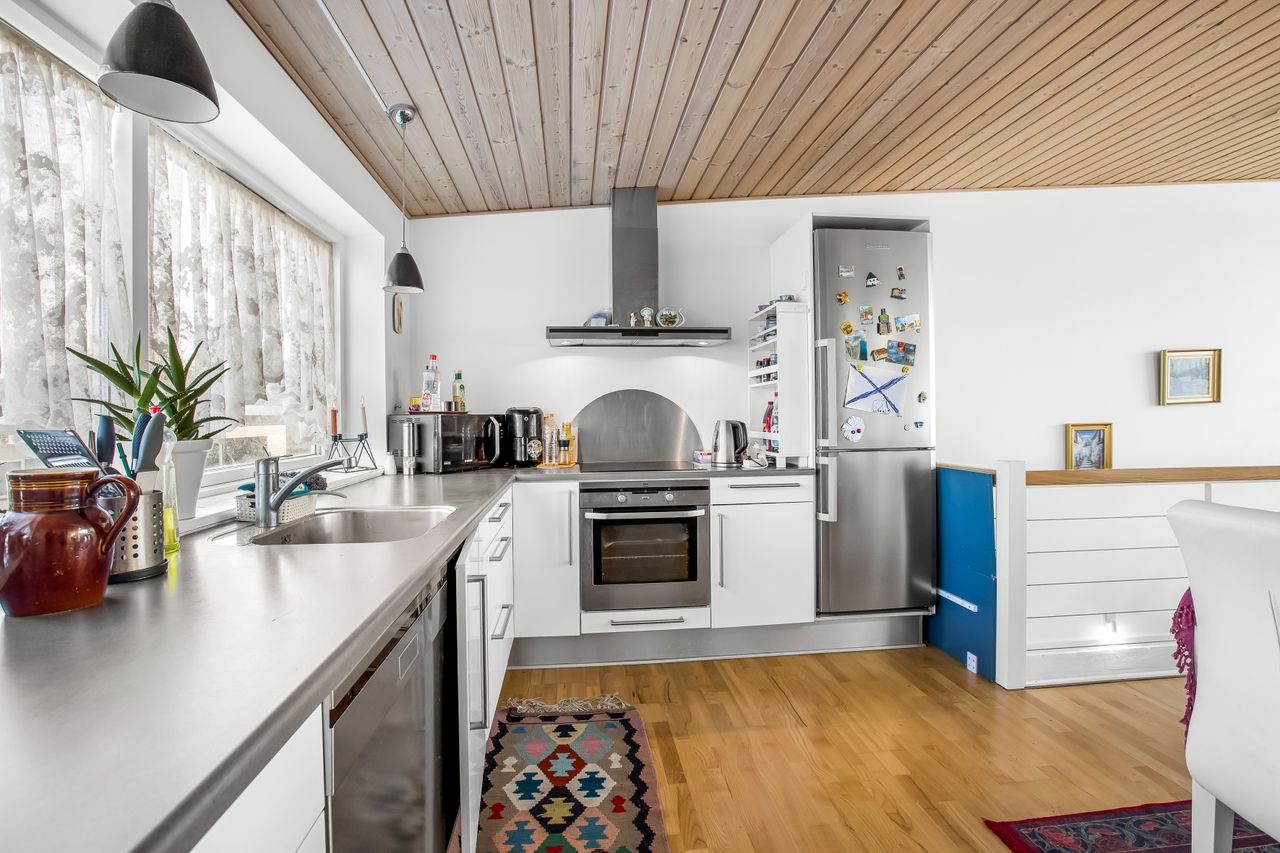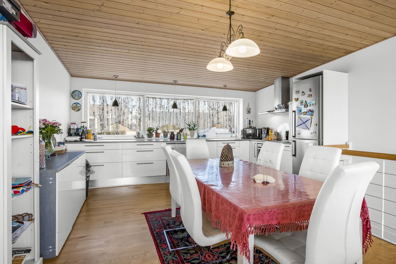 1. SAL: Her finder du et helt igennem fantastisk køkken/alrum med åben forbindelse til den hyggelige og lyse stue - fra stuen er der udgang til altan, som giver rig mulighed for, at sætte sig ud og nyde solen, kaffen og den skønne udsigt. Det flotte køkken er et Svane Køkken med lyse låger og gode store skuffer. I køkkenet er der masser af god arbejdsplads, så hele familien kan samles i køkkenet.