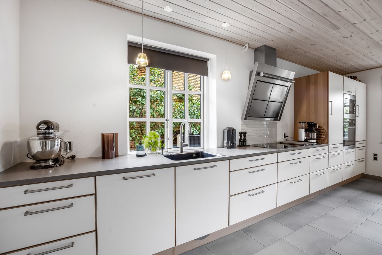 Man er kun lige kommet indenfor døren i denne smukke villa, så mødes man af den flotte svungne trappe til første sal i den præsentable entre. Husets hyggelige køkken med inventar fra Designa er pænt, lyst og særdeles velholdt. Den elegante bordplade i silgranit komplementerer de lyse fronter på fornemmeste vis. I køkkenet er der gulvvarme, og så er der en dejlig stor spiseplads til hele familien. Villaen byder også på hele tre flotte stuer en suite, så her er masser af plads til både spisestue, opholdsstue og den dejligste stue tættest på haven, udsigten nydes og adgangen ud til den smukke have og dejlige terrasse er nærmest.