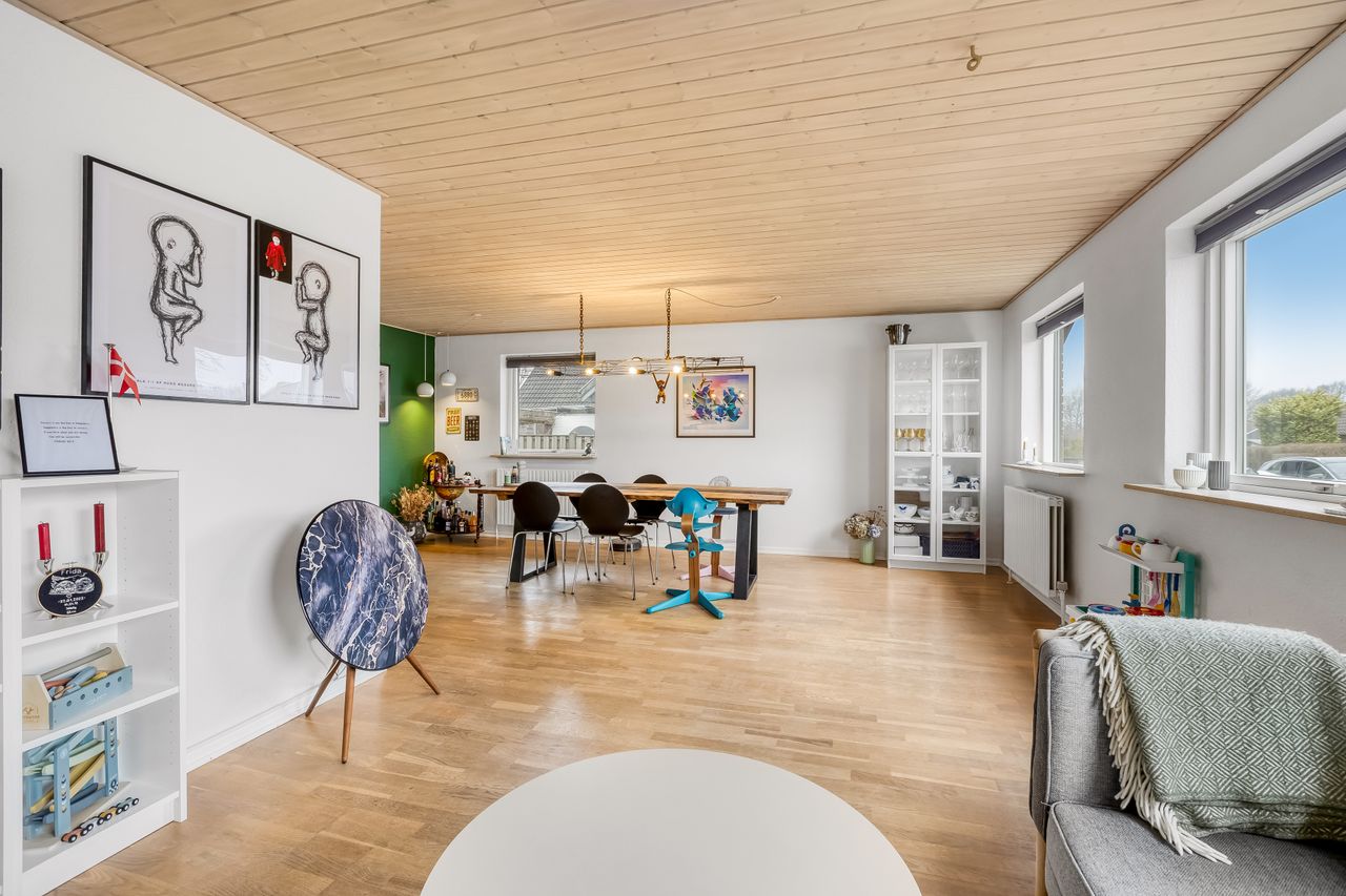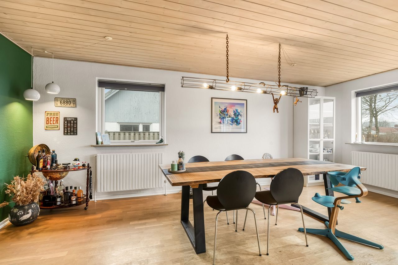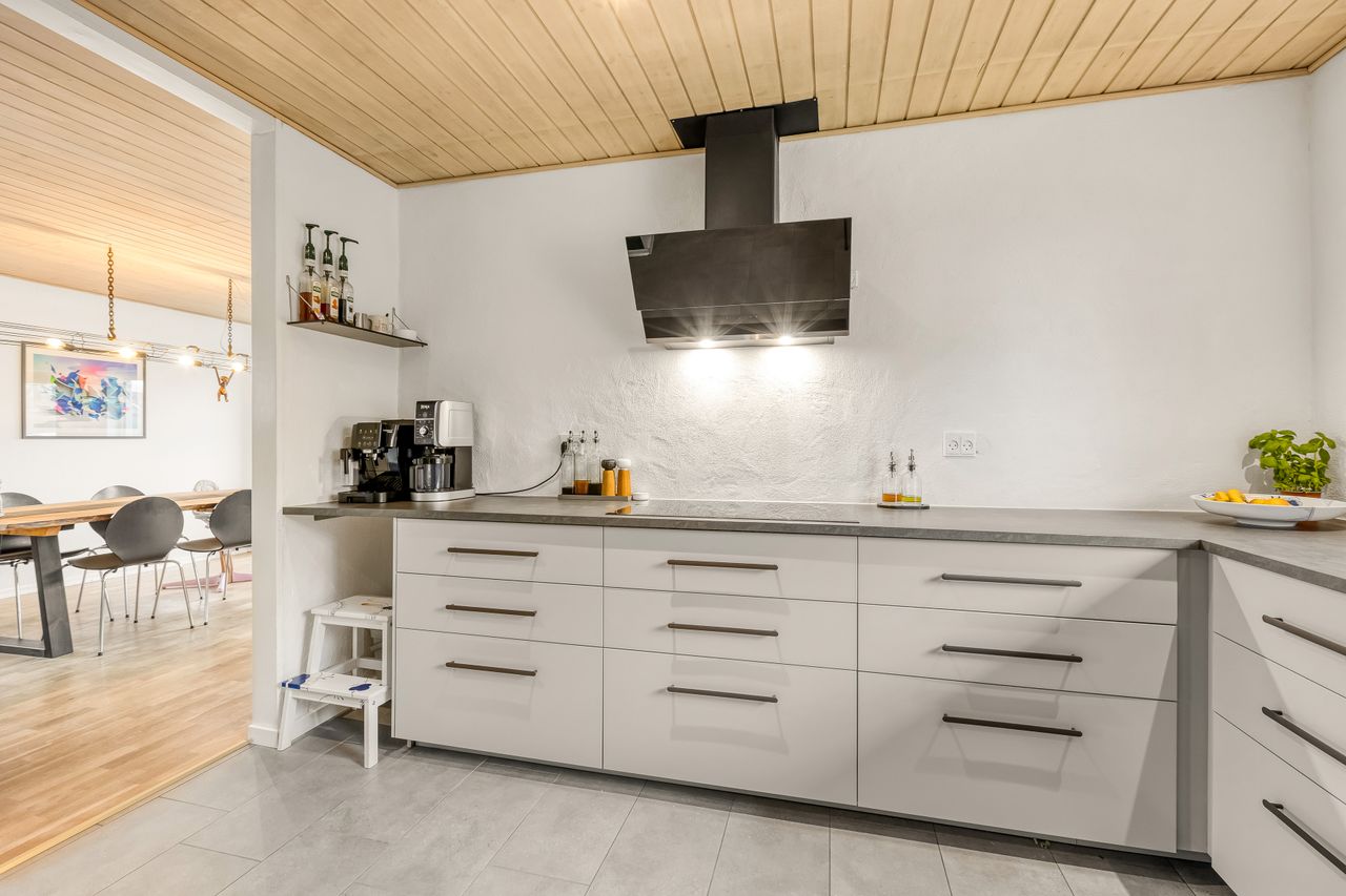Villaens hjerte, og stedet hvor familien samles, er uden tvivl det dejlige køkken/alrum, hvor hele familien samles. Herfra er der åbent til det lækre nye køkken, som blev etableret i 2023. De grå fronter komplementerer rummet på flotteste vis, og så er det virkelig et køkken, hvor alle de gode og praktiske løsninger er tænkt ind. Her er der masser af dejlig bordplads at arbejde på, og samtidig er der rigtig gode opbevaringsløsninger.