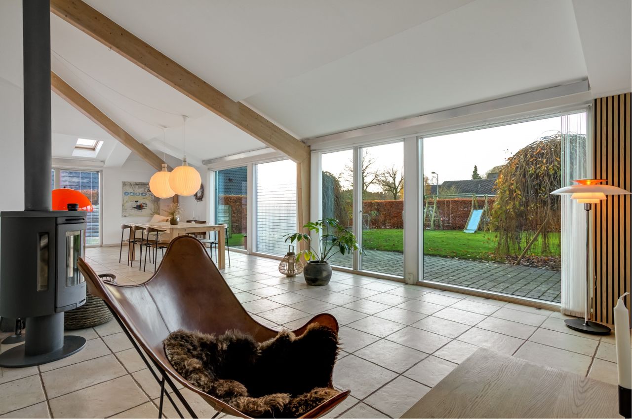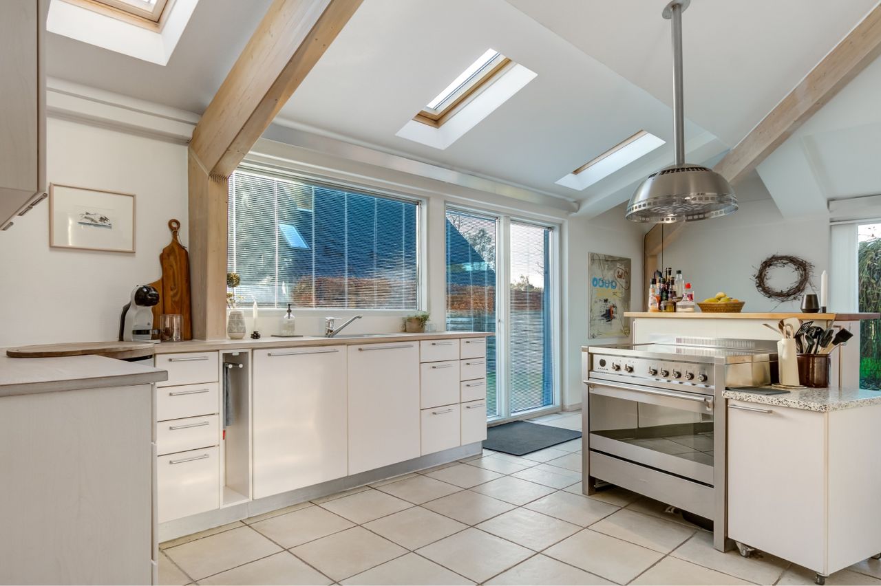 Villaens hjerte og familiens samlingspunkt er uden tvivl det store køkken/alrum med det helt fantastiske lysindfald. Der er højt til loftet, og kig til de synlige hanebånd. Der er en dejlig sammenhæng mellem køkken, alrum og stuen med den hyggelige brændeovn. Og uanset, hvor man kigger hen, er der udsigt til haven og de skønne grønne omgivelser. Der er praktiske skydedøre fra alrum og til terrasser. To rigtig gode værelser samt et stort soveværelse, hvor to værelser pt. er sammenlagt til ét stort soveværelse. Det vil sige, man har i alt 4 soverum i denne villa. Også i villaens værelser er de arkitektoniske løsninger gennemtænkte og ovenlysvinduerne og lofthøjden giver en skøn rumfornemmelse. Desuden er der et lækkert badeværelse med bruseniche samt et stort gæstetoilet, hvor der nemt ville kunne laves en bruseniche.