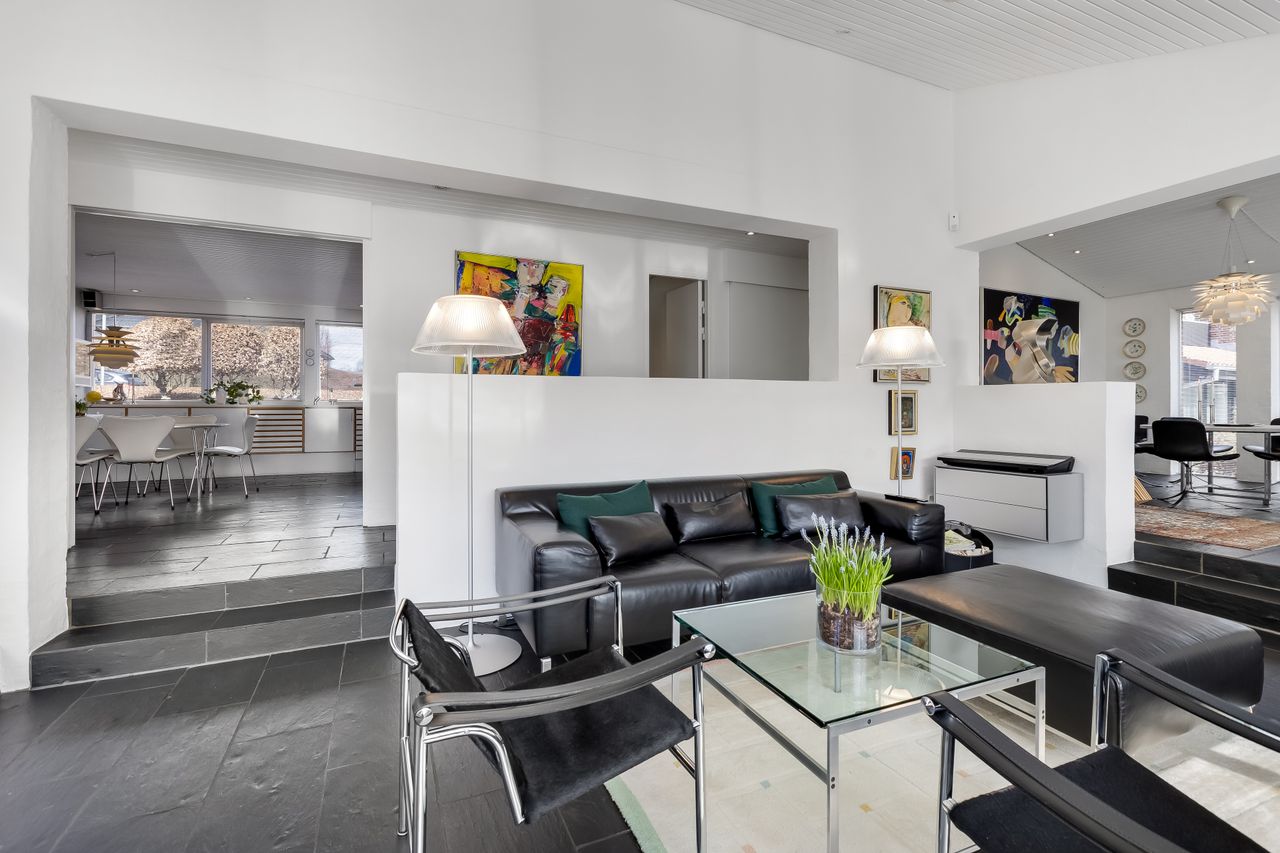 Villaen byder på en spændende og veldisponeret planløsning, hvor flotte lysindfald og smuk udsigt er tænkt ind i boligens hjerte.
