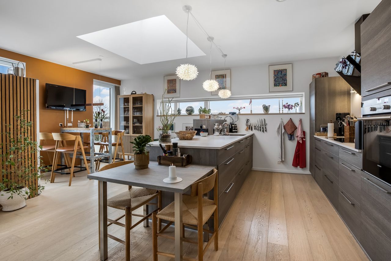 INDRETNING: Det første man møder, når man træder ind i denne smukke lejlighed, er en hyggelig entre i åben forbindelse med et helt unikt hjerterum. Et lækkert stort køkken/alrum fra Kvik i åben forbindelse til dejlig stue. Dette imponerende rum har de smukkeste lysindfald fra alle vinkler med alle dens vinduespartier samt ovenlysvinduer. Fra alrum er der udgang til en dejlig stor sydvendt altan med trægulv samt flot markise, så der også kan findes skygge. Lille fordelingsgang med adgang til gæstebadeværelse med flot håndvaskearrangement med støbt vask samt grå fronter, bruseniche og grå klinker. Lækkert stort soveværelse med skydeskabsarrangement og med direkte adgang til eget badeværelse, som er med flot håndvaskearrangement med støbt vask, grå fronter, bruseniche samt grå klinker. Endvidere byder lejligheden på et stort værelse med skydeskabsarrangement.