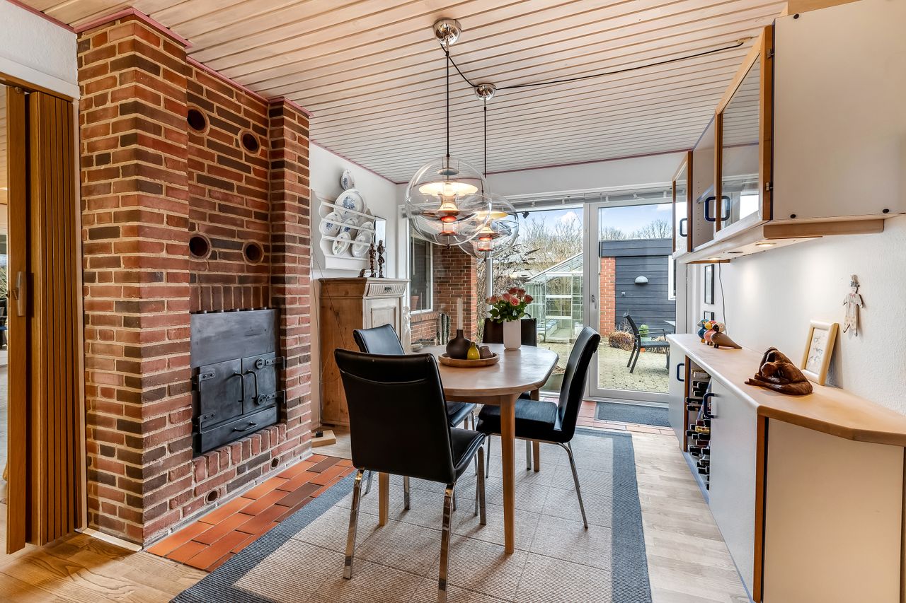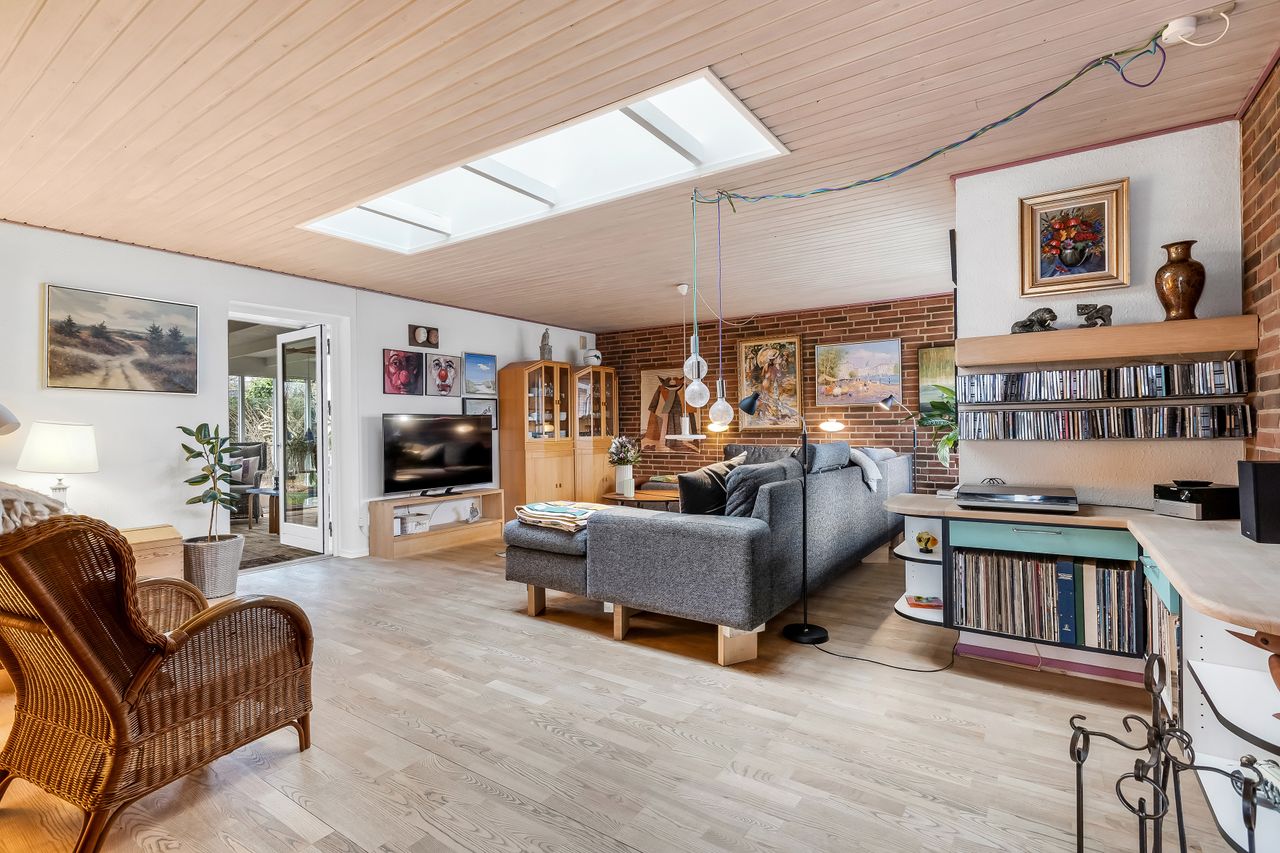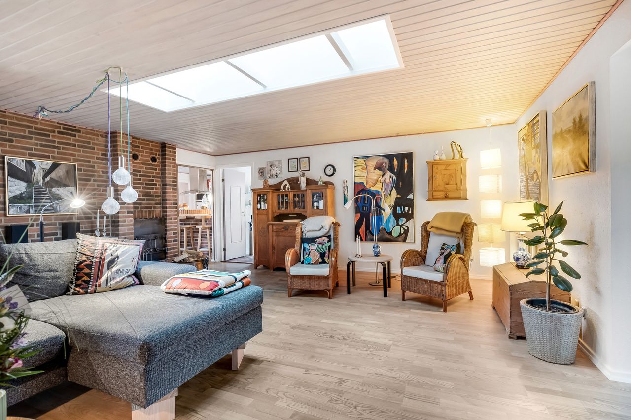 Villaens indretning passer perfekt til en aktiv familie, hvor det hyggelige køkken/alrum uden tvivl vil blive familiens samlingspunkt. Her kan man på en kold vinterdag samles om varmen fra brændeovnen og om sommeren kan man lade terrassedøren stå åben direkte ud til terrasse og have, så man kan høre børnenes glade grin, når de leger i haven. Fra alrummet er der indgang til en rigtig stor stue, hvor man i forbindelse med etableringen af det nye tag, har fået lavet et helt fantastisk ovenlys med lysskakt, der på fineste vis trækker masser af dagslys direkte ind i stuen. I lysskakten er der også kig til de flotte spær. Brændeovnen fra alrummet er gennemgående til stue, så her får man også glæde af den.